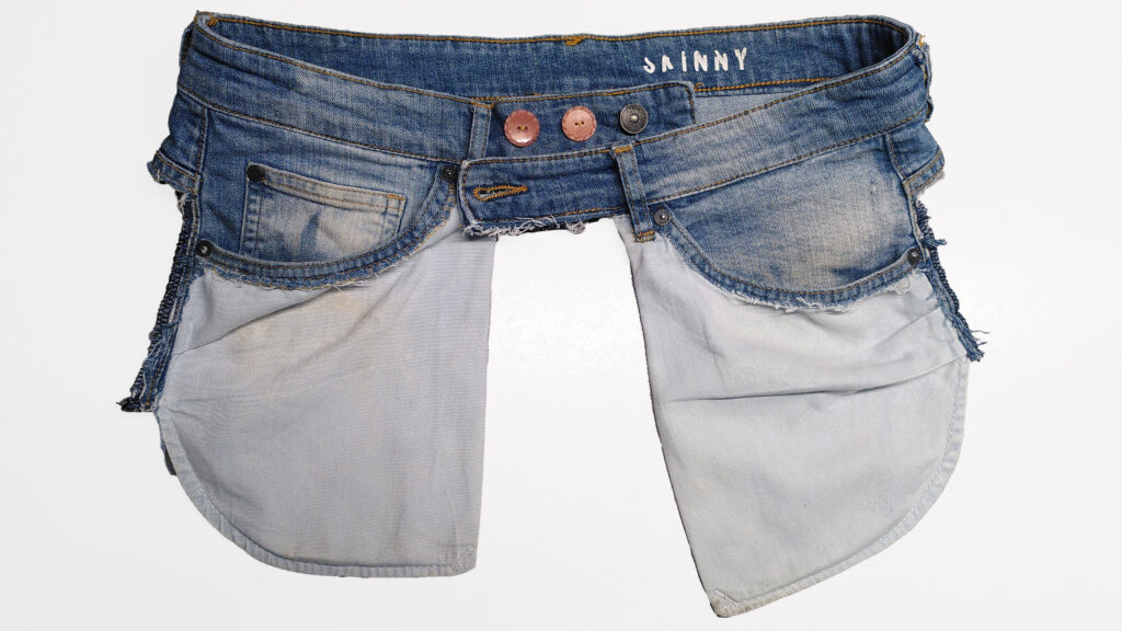 Je hebt een oude jeans nodig die redelijk past (je kunt er een extra knoop aannaaien om de band strakker te maken, of een stuk stof toevoegen om de band losser te maken) en een schaar.